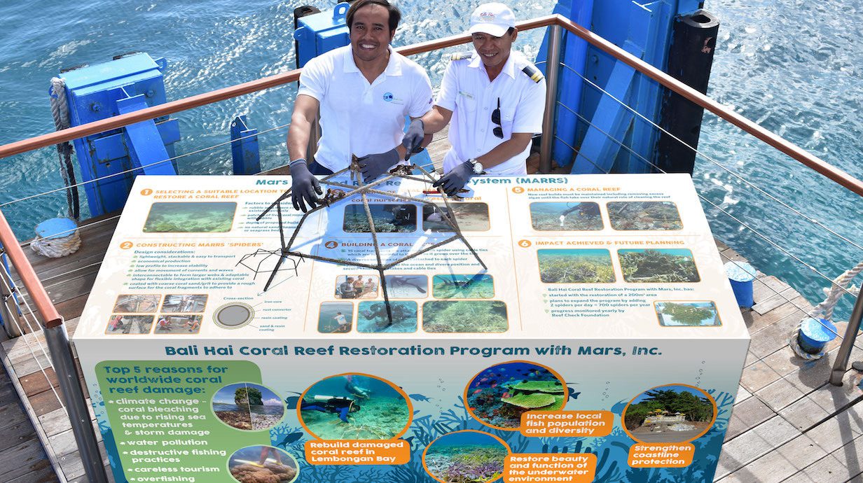 In 2017 Bali Hai Cruises pioneered a novel partnership model by collaborating with our team to become the first tourism operator who requested formal training in the MARRS technique with the goal of setting up their own restoration program. Since then, Bali Hai Cruises has installed more than 1,000 Reef Stars, showcasing their work to the public through an interactive conservation tour on the Bali Hai Pontoon. Tourists can experience first-hand the magic of coral reefs and the value of responsible restoration with Bali Hai Diving Adventures.