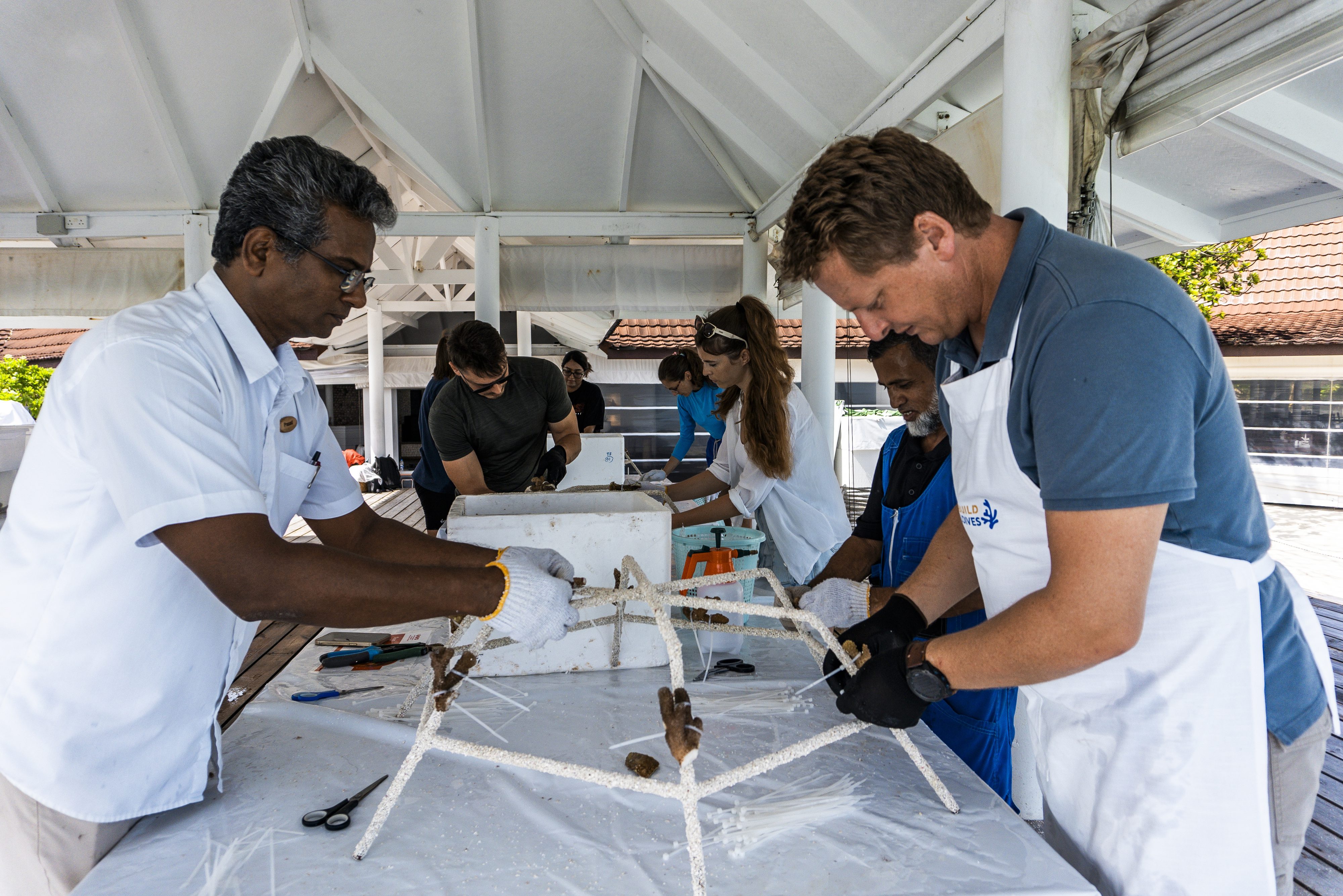 Determined to counter this trajectory on their doorstep, the Big Build Maldives 2024 is a testament to resilience and hope in a time where action is needed. The project brought together restoration experts and marine biologists, engineers, resort staff, locals, guests, and the leadership of Planhotel Hospitality Group. Following months of planning and preparation, manufacturing and coating of reef stars and navigating the challenges of remote island logistics, the dedicated team was ready for the ‘Big Build’. The restaurant deck transformed into a bustling workshop where volunteers attached coral fragments to reef stars under the guidance of Mars’ experts. On the final day, the presence of Planhotel’s president, Ms. Sara Rosso, and Managing Director of Voyages Maldives and Seagull Group, Mr. Salah Shihab, highlighted the project’s importance and unified spirit.