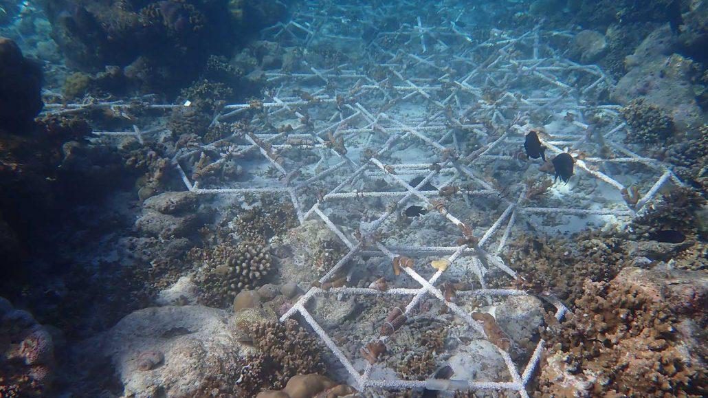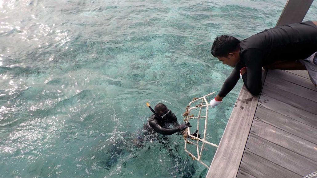 Hurawalhi Resort has a strong interest in the protection of the coral reefs that their business, tourists and island communities depend on. In August 2021, Mars Sustainable Solutions trained their staff in Reef Star restoration, establishing a MARRS web of Reef Stars on the top reef near Kashibo. In November 2021, the restoration area was extended down the reef slope in front of the 5.8 Undersea Restaurant, with regular monitoring activities following each build.
