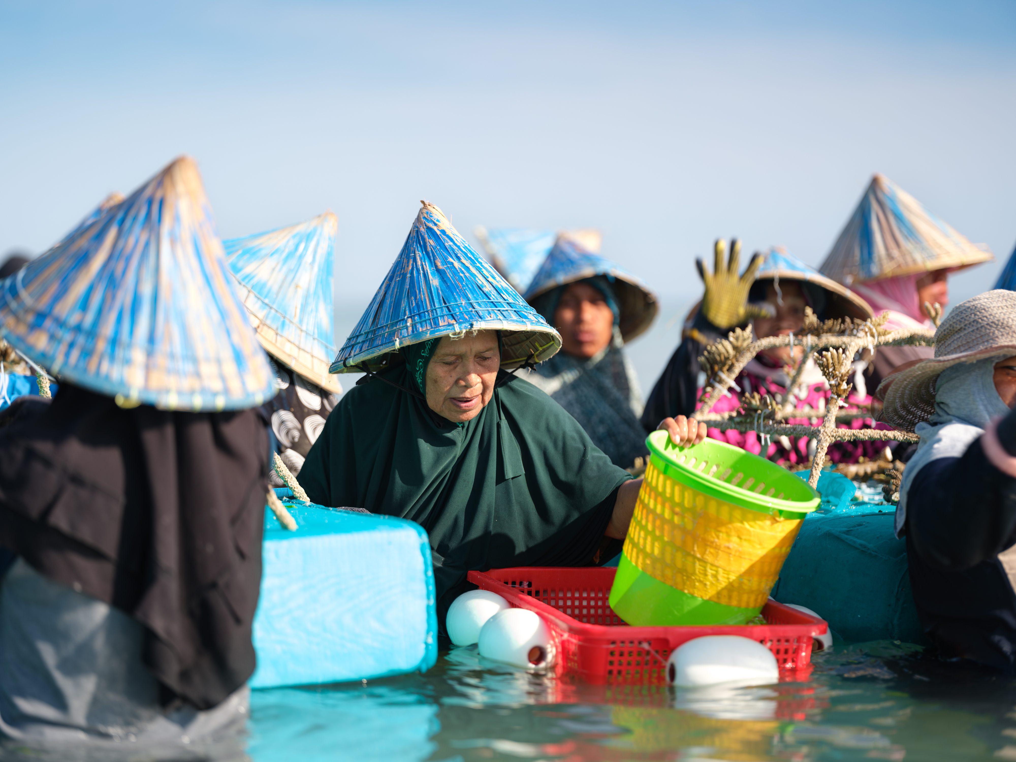 Local community taking part in the coral tying process