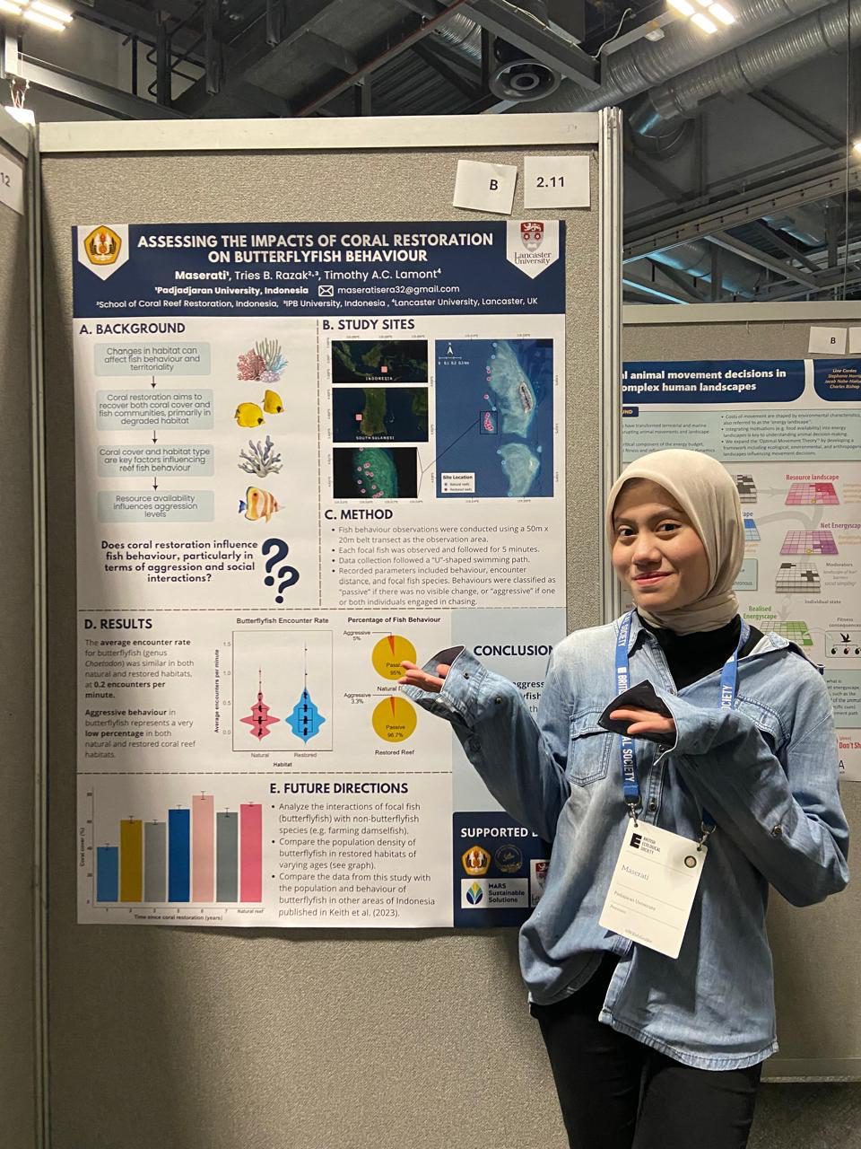 Maserati and Jane had unique experiences at each conference. Maserati delivered poster presentations at both events, with a particular highlight being at RCUK, where her poster earned her the Runner-Up for Best Poster Award. Jane presented her research as a talk at RCUK and via a poster presentation at BES. At both events, their work was well received and attracted considerable attention from many other scientists. People were fascinated to hear their insights on how fish communities have developed and are behaving on restored coral reefs at Bontosua Island.