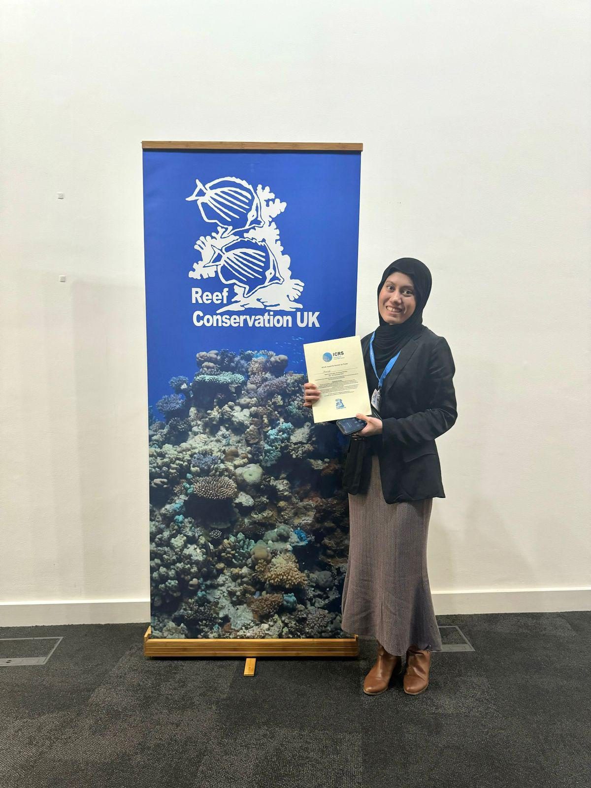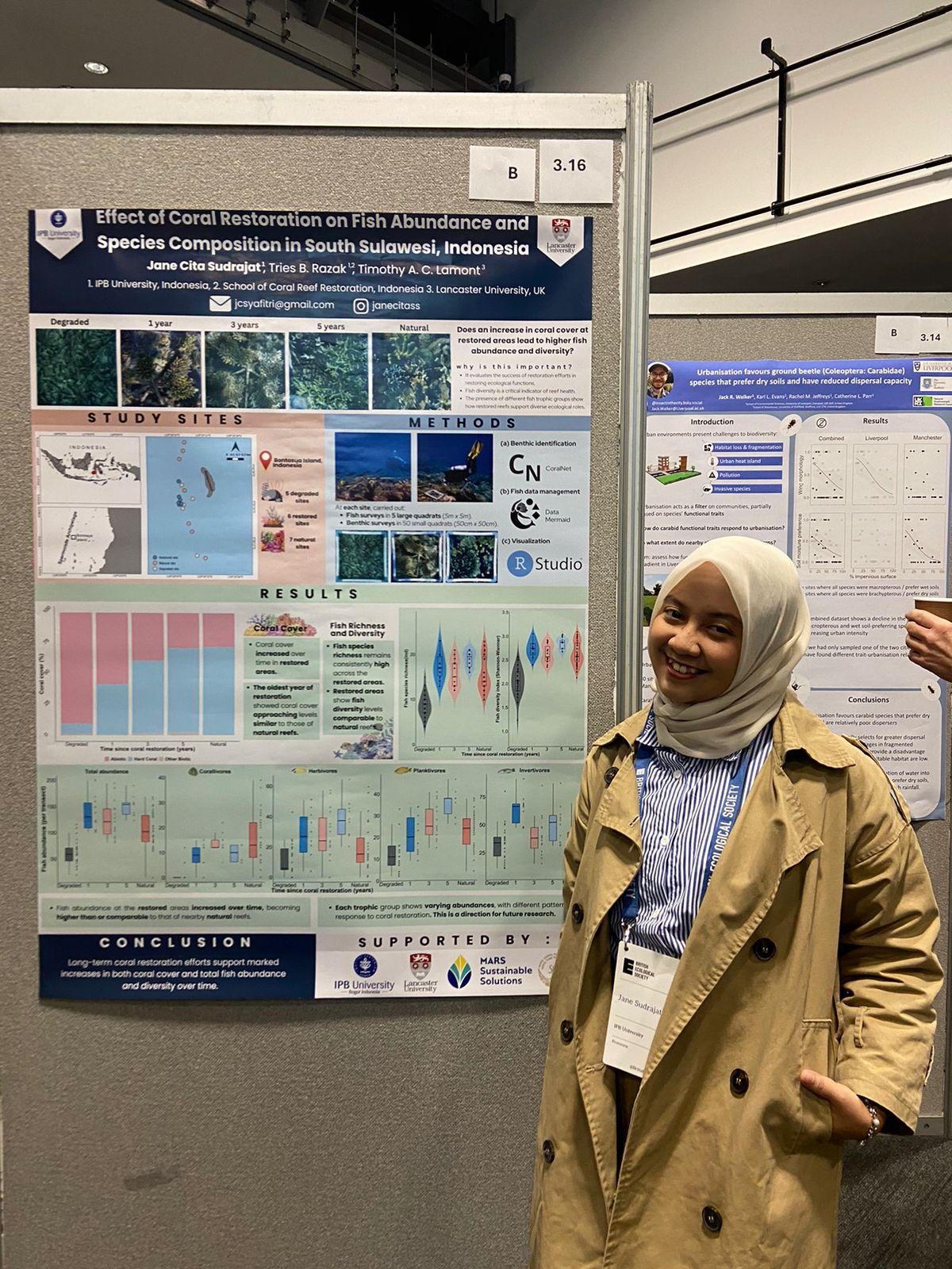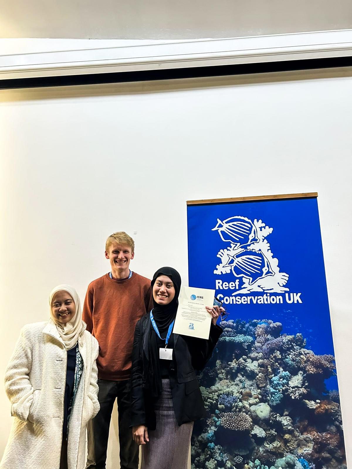 Sheba-supported Indonesian postgraduate students Maserati (Padjadjaran University) and Jane Cita (IPB University) have been carrying out ecological research on the Mars coral restoration programme as part of their Masters degrees. They recently gained invaluable experience by attending two prestigious international conferences: the Reef Conservation UK (RCUK) Annual Meeting in London on 29th November 2024, and the British Ecological Society (BES) Annual Meeting from 10th to 13th December 2024. These conferences provided them with opportunities to enhance their ongoing research in distinct areas—Maserati focuses on fish behaviour, while Jane specializes in fish community development.
